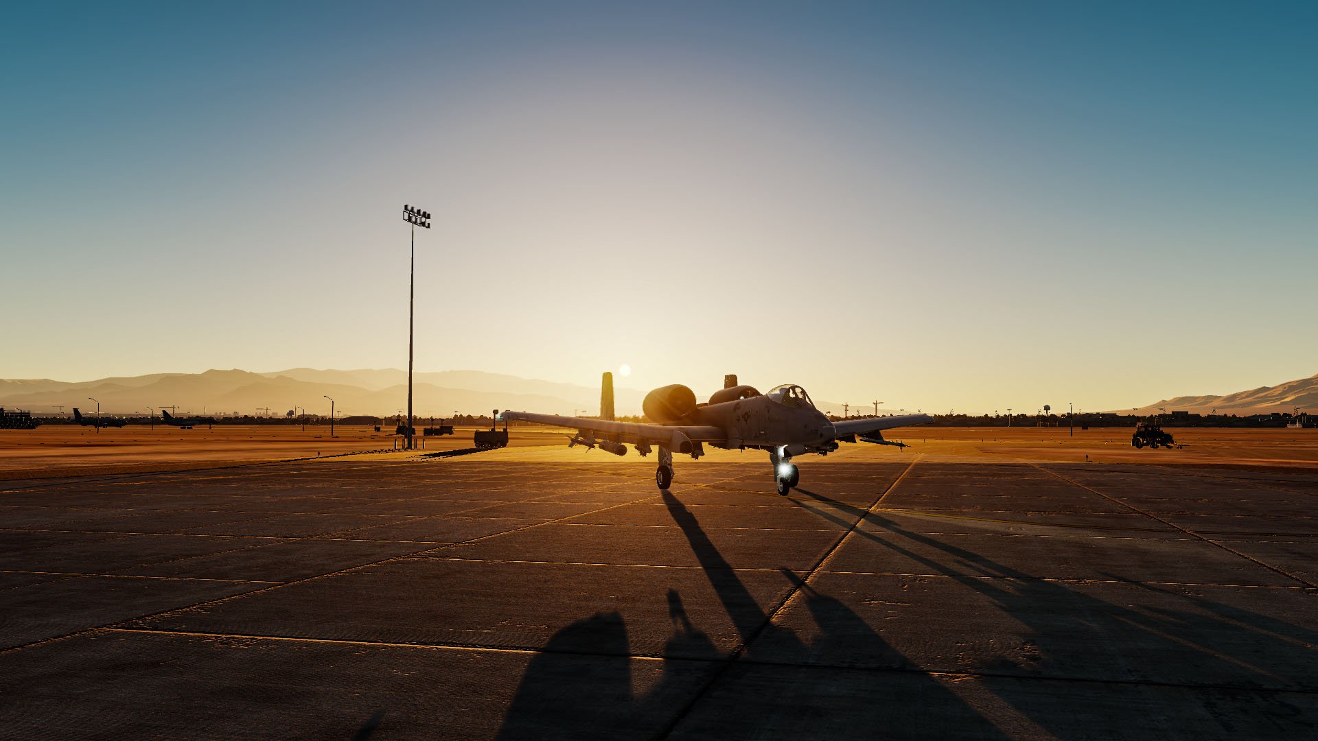 Eine A-10C der 1. "Black Dragons" auf dem Vorfeld bei Sonnenuntergang. Nellis AFB, 2021. Stingray.