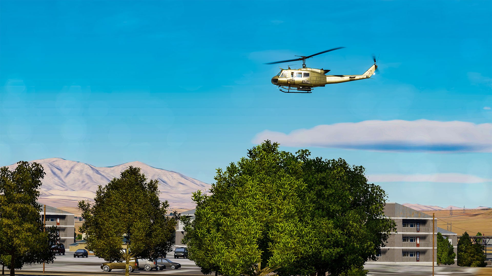 Zwei UH-1H der 2. "Blade Riders" fliegen einen Orbit um eine dritte UH-1H, die Bodentruppen auf einem Dach absetzt. Nellis AFB, 2021. Rakuzard.